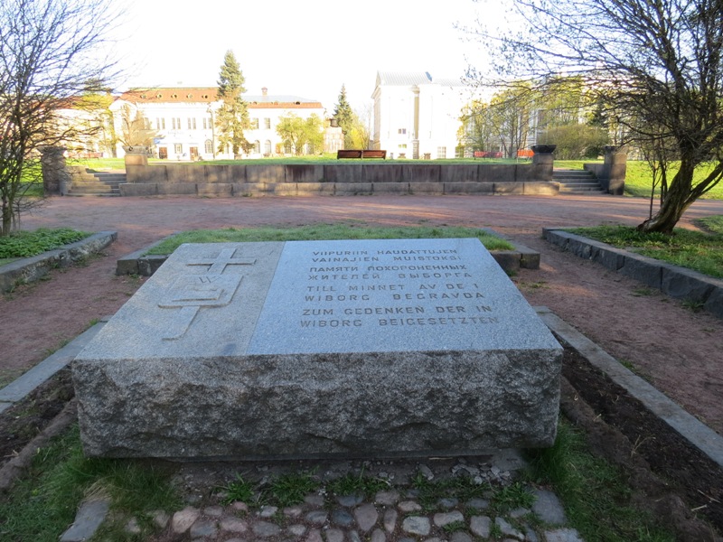 Hautamuistokivi Viipurin kirjaston vieressä.