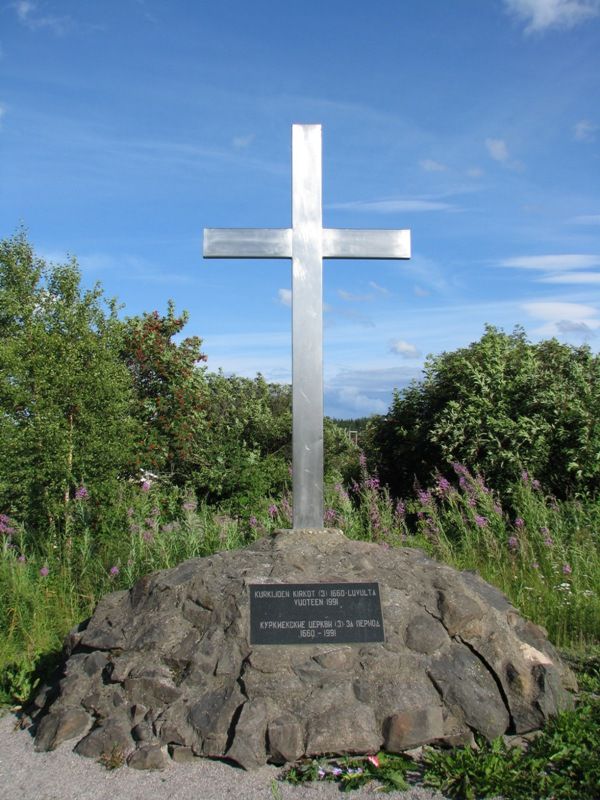 Kurkijoen kirkon muistoristi. Puinen kirkko paloi v.1991.