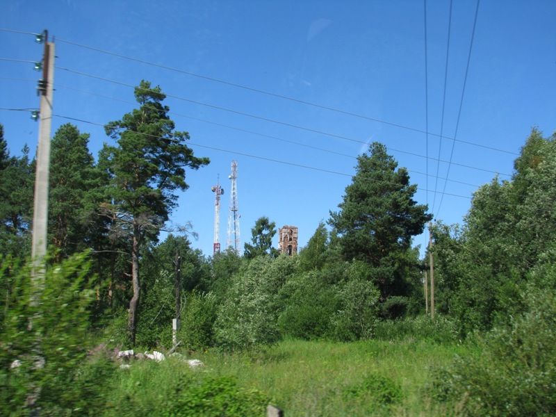 Salmin kirkon rauniot pilkistää puiden lomasta.