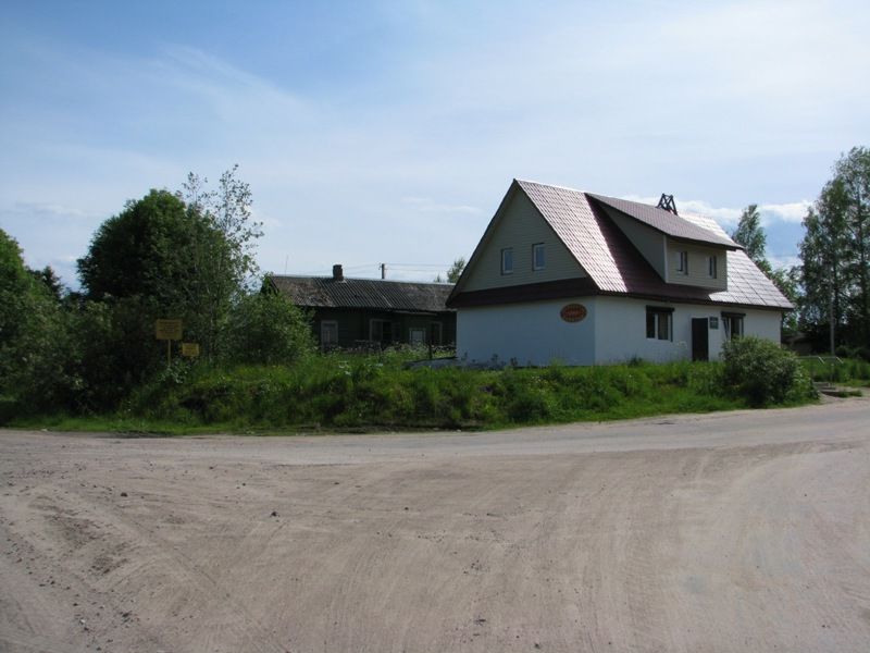 Pyhäjärven Riiskan kylän kauppa ja takana vanha suomalainen rakennus.