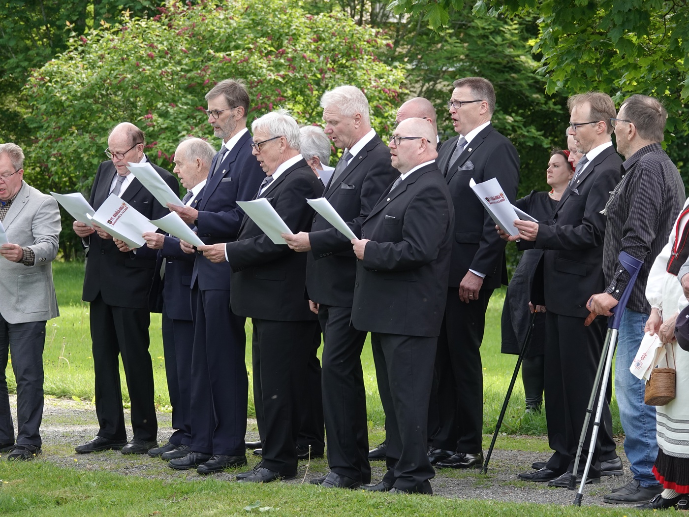 Kunnianosoitus Sankarihaudalla ja Karjalaan jääneiden vainajien muistomerkillä. Kokemäen mieslaulajat.