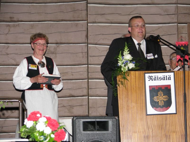 Pääjuhlassa palkittiin ansioituneita. Jakajina Räisäläisten Säätiön Raija Seppä ja Pekka Lehtiö.