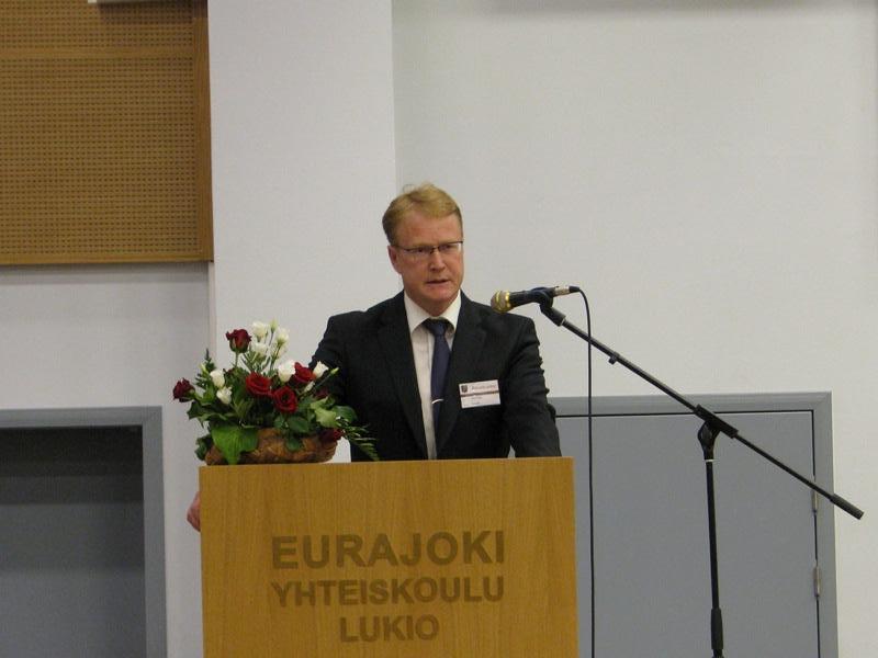 Pääjuhlassa Eurajoen kunnan tervehdys kunnanjohtaja Harri Hiitiö.