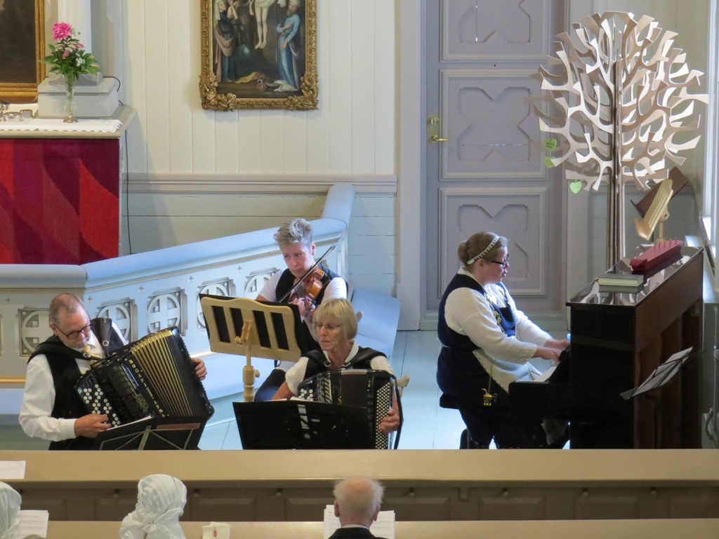 Kanttori Sari Mäkinen, alttoviulu Satu Mäenpää, harmonikka Raja Majamäki ja Ari Helkiö.