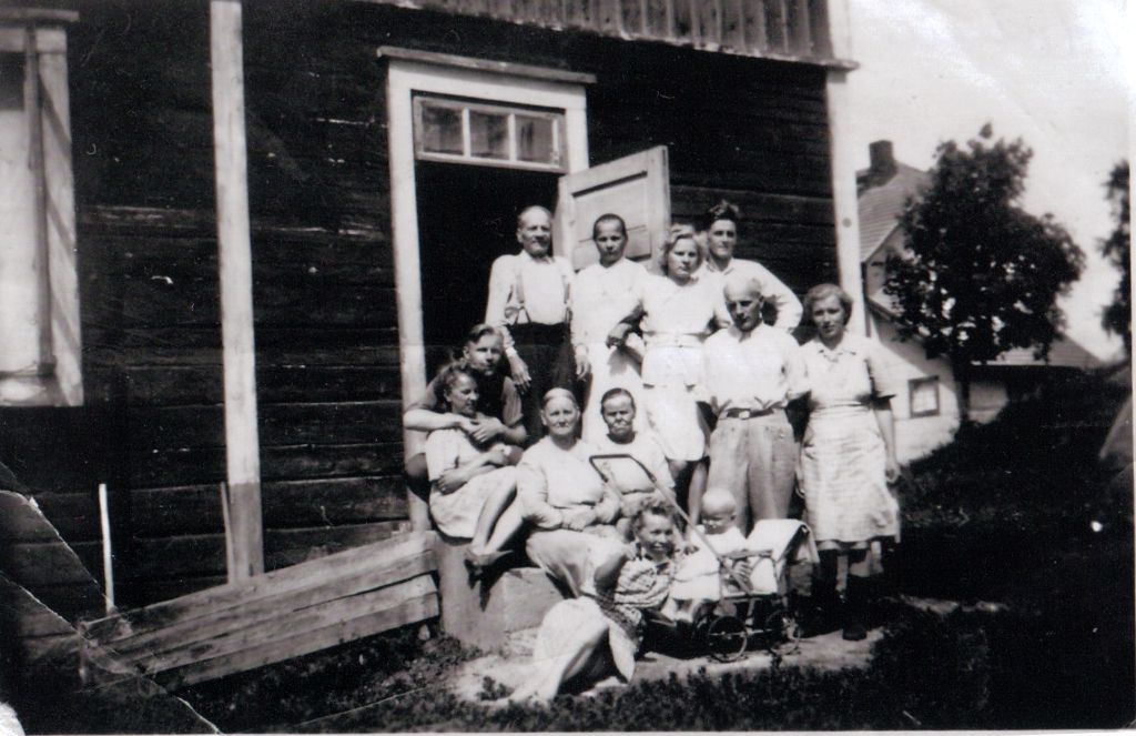 Evakkoaikaa Kokemäen Horellissa 1947 . Ylh. vas. Pekka Skaffari, Hilda Rakkolainen os. Skaffari, Helvi Tuomi os.Skaffari, Ahti Tuomi. Seur rivi vas. Tyyne Puru os. Skaffari, Eino Puru, Anni Skaffari, Maria Karilainen, Onni Skaffari ja Lempi Skaffari os. Sikiö. Edessä Ida Syväsalmi os. Skaffari ja rattaissa Raija Skaffari.
