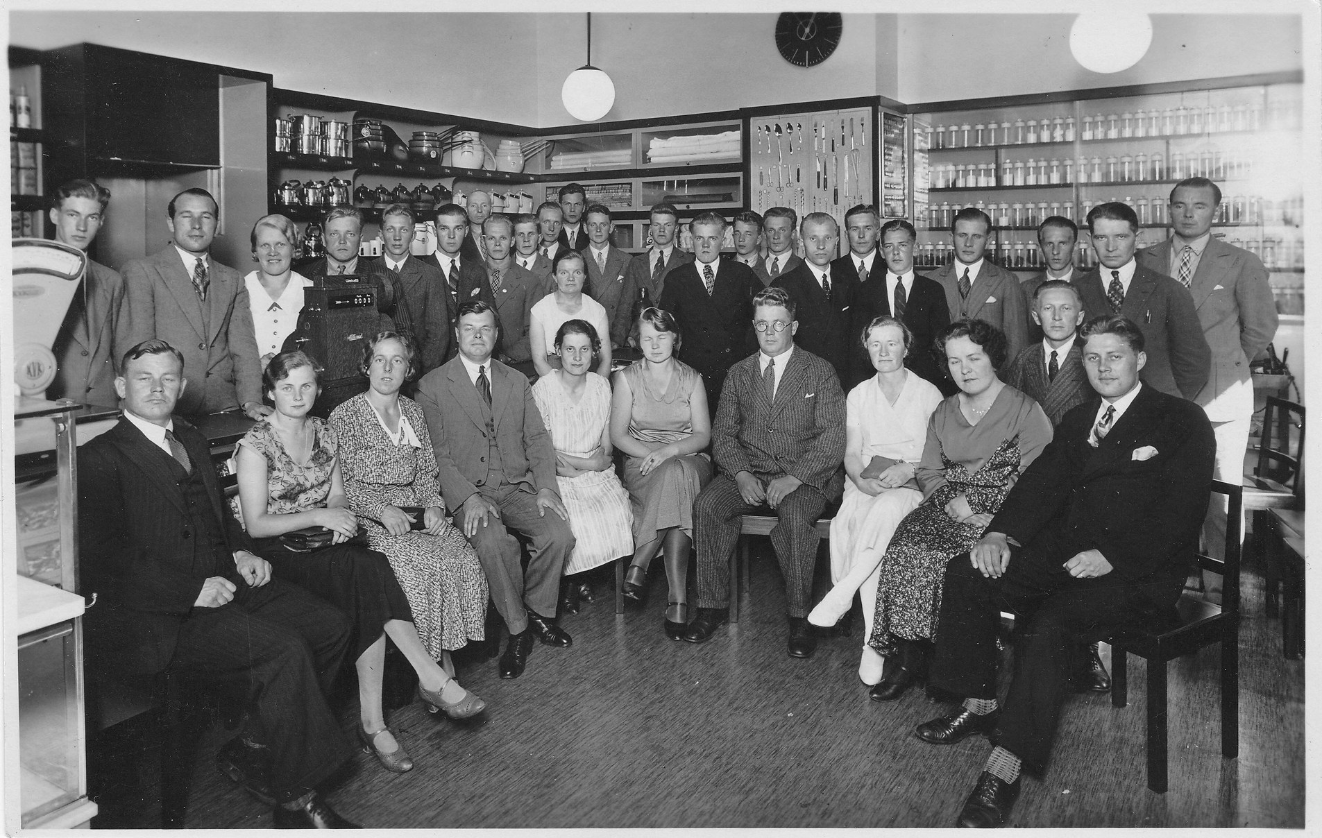 Silmälasipäinen henkilö edessä on ehkä kouluneuvos Yrjö Länsiluoto. Kuvausaika 1930-luvulla. Kuvauspaikka ehkä Helsinki. Hän toimi vuodesta 1934 kouluhallituksen kansanopetusosastolla kouluneuvoksena.